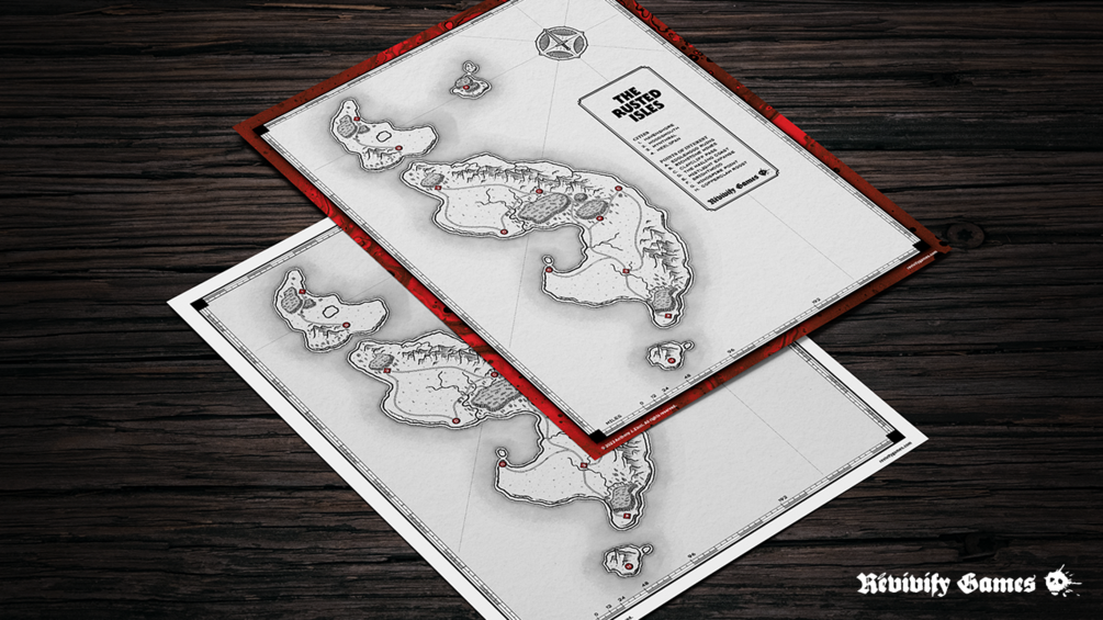 A free map of The Rusted Isles. Explore a continent of islands connected by a range of mountains and covered in plains and forests. The nearby remote islands are perfect for a decayed ruin adventure and a mountain mega dungeon.