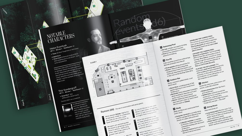 Buried deep within the twisting streets and endless hedge rows of the hills is the mansion of Helon Evontusk. Members of the board have tasked the punks with infiltrating Helon's home and finding a way to remove him from his position as CEO. If they can do this and escape without being captured, they will be rewarded with a massive collection of creds and some cutting-edge cybertech for the effort.